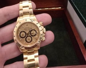 The bezel of the new GMT-Master II is solid 18k Yellow gold with a 24-hour Cerachrom insert — we’ll get to this in a minute. The bezel mechanism operates through a ball-bearing mechanism, rotating in both directions with 24 “clicks,” one for each time zone. Every year, I hope high quality Rolex copy watches will update this bezel mechanism. While tactility and the sound of the bezel are certainly subjective, I cannot help but be disappointed with the mushy feeling of the bezel action that sounds more like a muffled thump than a click. Out of all the refined details that make cheap Rolex fake watches feel good, this bezel always disappoints. If we ignore this action, the bezel is genuinely phenomenal. The bi-color insert features a highly polished black ceramic on the top half and a polished gray lower half. Even number graduations are engraved and filled with gold that receives a spectacular frosted finish. The hue of gray chosen is excellent; while I do not know the exact color code, it is reminiscent of menacing thunderclouds. The brilliance of using this color combined with the polished finish is that it often disappears and remains neutral. In some light, you cannot differentiate the gray from the black segment, but as reflections shift, it becomes visible again. It is an elegant solution to provide a day-night indicator without using a polarizing color while still allowing Rolex to flex its bicolor ceramic bezel production capabilities. Additionally, the gray paired with yellow gold feels decidedly modern despite the somewhat vintage vibe created by the two-tone (or full gold) jubilee bracelet.