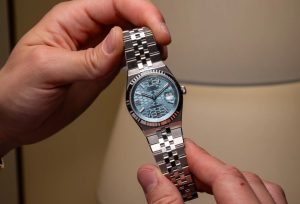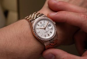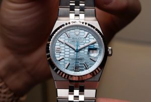 What surprised me most was just how detailed the dials were. As Rolex is positioning the Land-Dweller as a daily wearer, I would have expected a simple, lacquered or sunburst dial to be the one the replica watches UK are launched with. Instead, we got this honeycomb that makes the whole dial quite busy, especially with the numerous lines of text, cyclops lens, and Arabic numerals there at the same time. In any case, the Rolesor and Everose variants get an opaline white colour, with case-matching hands and indices, while the 950 platinum expectedly goes for an ice blue.