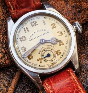Of course, it’s the dial that truly captures the imagination here. For an 81-year-old watch, the patina is stunningly even, aging the main dial surface to a warm cream tone while the radium lume takes on the striking caramel khaki hue that so many manufacturers look to emulate these days in tinted Super-LumiNova. The 6 o’clock running seconds subdial is a brilliantly evocative little showcase of early 20th-century graphic design, with swooping serif numerals and a chemin de fer scale surrounding a dramatic blued needle hand. With the main handset, the perfect Rolex replica watches show the trademark Rolex “Mercedes” handset in one of its earliest forms, featuring a broad tapering shape that makes this design impressively legible for such a small timepiece. What made this more than another watch in a display full of vintage Rolex models, however, is the text at 12 o’clock. Jeweler-signed dials are a well-known attraction in vintage enthusiast circles, and collectors seek out well-known jewelry dealers such as Tiffany & Co. or Türler as a way to set vintage timepieces apart from the crowd. P. Orr & Sons, on the other hand, was not a jeweler I had ever heard of, and the two listed cities on the dial immediately sent my mind racing with possibility. For those unaware, neither Madras nor Rangoon exist on any map in the modern world. Now respectively known as Chennai, India and Yangon, Myanmar, at the time, these two cities were some of the brightest jewels in the crown of British-controlled south Asia. With two simple lines of text, this timepiece had opened up a door to another world, one that had long since vanished in the wake of a world war, decolonization, and nearly a century of growth.